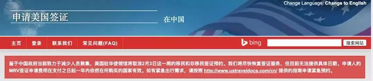 目前美領館網站宣布的,在二月三日這周暫停美國簽證服務,該舉動是響應,1月31日北京市政府發(fā)布關于新型冠狀病毒感染的肺炎疫情防控通知中指出的非必要行業(yè),二月九日24時前,彈性靈活工作,避免造成不必要的人群聚集。
