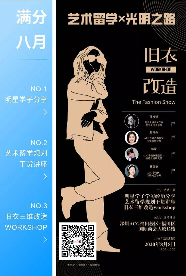 你的藝術(shù)留學(xué)之路開始準(zhǔn)備了嗎?如果現(xiàn)在你還是迷茫,沒有方向!不妨8月8日(本周六)來到ACG深圳校區(qū),一起聽聽ACG大滿貫學(xué)員的經(jīng)驗(yàn)分享、以及2020年最新的藝術(shù)留學(xué)規(guī)劃吧!
